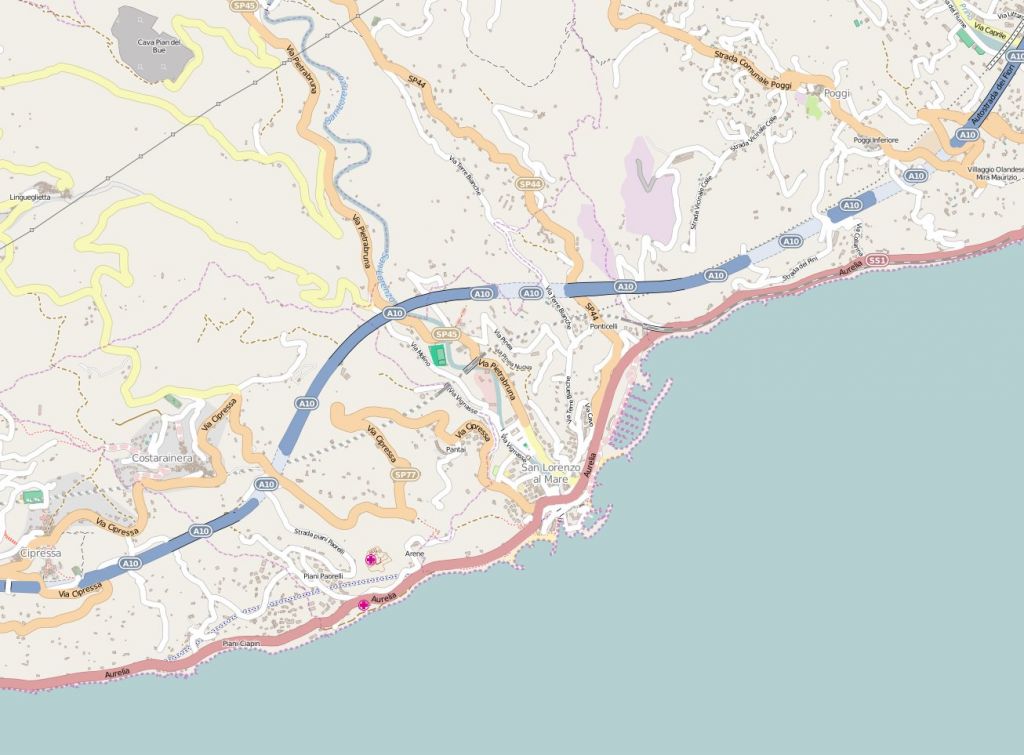 Von dem Castello Platz in San Lorenzo aus geht man die Via Terre Bianche eine ziemlich starke Steigung aufwärts, die ein Wohngebiet mit einem wunderbaren Meerblick durchquert, die asphaltierte Fahrbahn führt an nahegelegenen Olivenhainen und Gebiete mit mediterraner Macchia vorbei.
